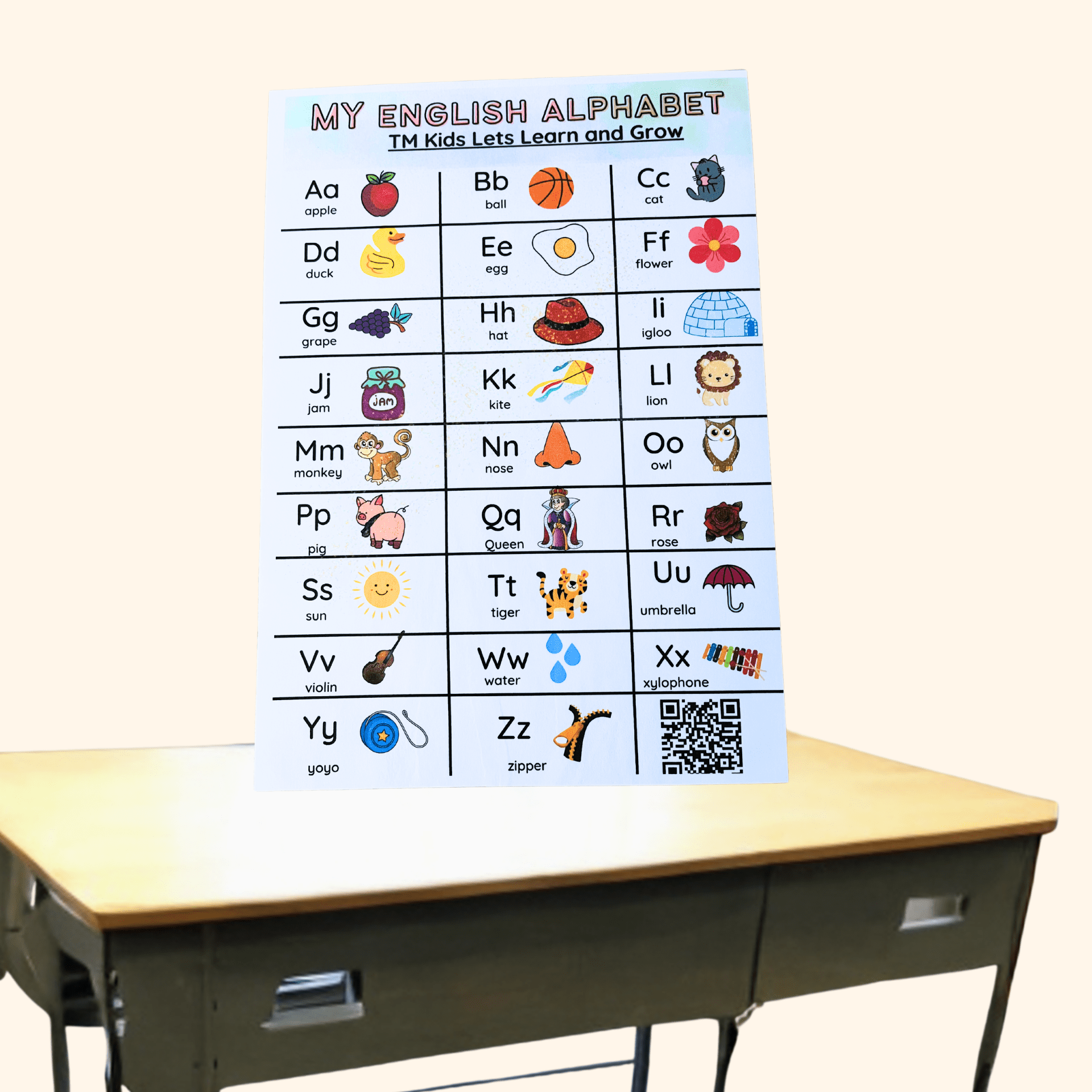 My English Alphabet Chart Introduce your child to the English alphabet with this colorful and interactive chart. It helps kids learn letters, recognize objects, and associate words with images, making it a fun and engaging learning experience. Features: Each letter (A-Z) paired with an object and image for easy learning (e.g., A for Apple, B…